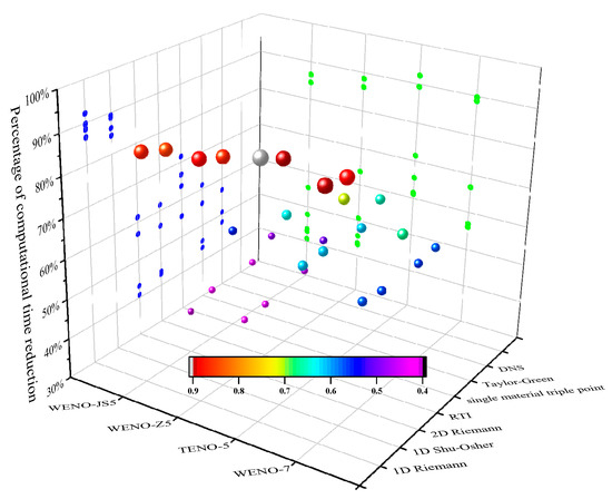 The previous section demonstrated the efficacy of the ADMD scheme in one-, two-, and three-dimensional computations. Its adaptive dispersion and dissipation control properties enable the accurate calculation of flow field discontinuities and the capture of small-scale structures. The simple construction of the ADMD scheme significantly reduces calculation time. This section expands on previous findings by providing a quantitative analysis and delving deeper into this aspect. Figure 36 presents a three-dimensional scatter plot that illustrates the percentage reduction in calculation time achieved by the ADMD scheme compared to the WENO-JS5, WENO-Z5, TENO-5, and WENO-7 schemes in the test cases mentioned.