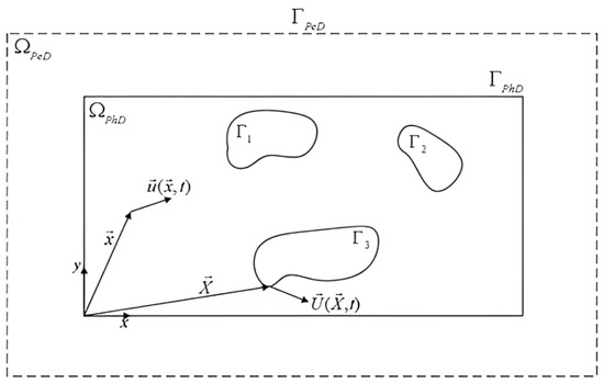 The immersed boundary method (IBM) employs two computational domains: the Eulerian and Lagrangian domains. In the Eulerian domain, the governing equations for fluid flow are solved; meanwhile, in the Lagrangian domain, the force field is evaluated to represent the immersed interface within the flow [15]. The interaction between these domains is facilitated through a source term added to the Navier–Stokes equations, as shown in Equation (4). This source term is defined throughout the Eulerian domain but is distributed based on its representation in the Lagrangian domain, as expressed in Equation (5).