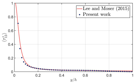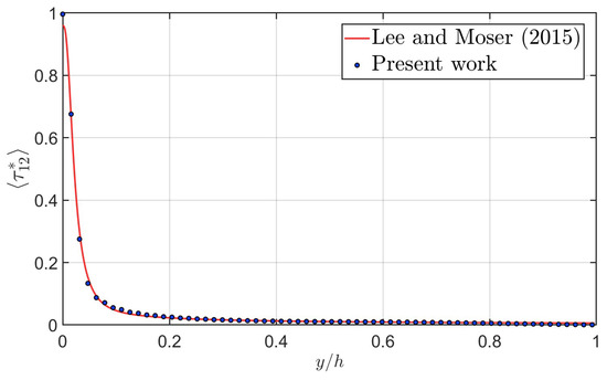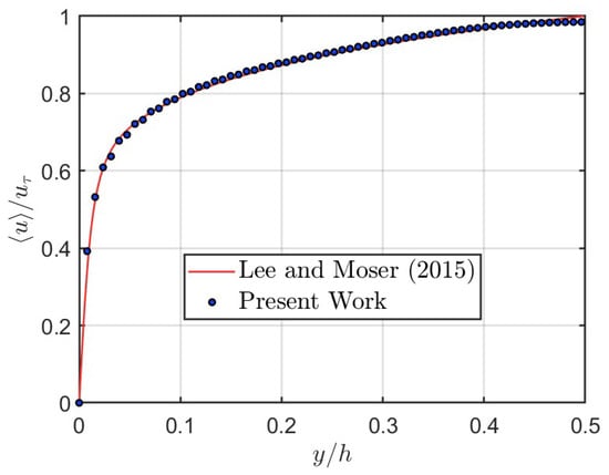 From the initial velocity field, the governing equations were integrated in time until the numerical solution reached a statistically steady state. The attainment of this state was determined by monitoring the convergence behavior of key parameters, such as the wall shear stress and the mean velocity at the channel center line (). Statistical steady-state conditions were confirmed when these parameters displayed negligible variations over time, exhibiting approximately periodic behavior.