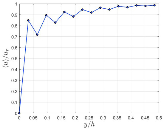 For , simulations were conducted using different mesh configurations to evaluate the impact of spatial resolution on the accuracy of the results. Figure 9, Figure 10, Figure 11 and Figure 12 show the mean velocity profiles obtained for meshes with resolutions of , , , and grid points.