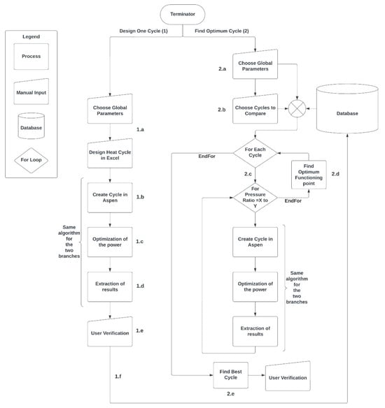 A schematic overview of the GT Modular Design Application (MDA) functioning, including two branches for the two modes of operation. The first branch (“Design One Cycle”) results in a database that subsequently feeds the second branch (‘Find Optimum Working Cycle”).