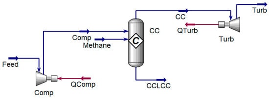 Even if the RNG energy cost is under the maximum allowable limit, i.e., 0.058 USD/kWh, considering the volatility in the global fuel market price and the new investments performed by the company, this solution seems not the best in this case (2). The solution proposed to the company is, therefore, a regenerative Brayton cycle, including two compressors and three turbines fueled with methane. This solution allows for the reuse of the core of the first solution (case study (1)) by reusing one compressor, the combustion chamber, one HC, and the heat exchanger, hence contributing to a more sustainable HC design solution.