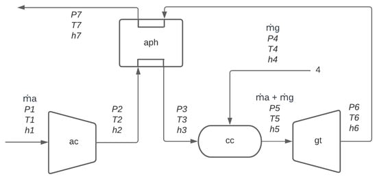 where, P represents the pressure, T the temperature, the mass flow, h the enthalpy, and η the isentropic efficiency. These variables are illustrated in Figure 5.