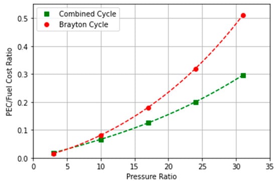 Ratio of the calculated PEC/fuel cost in the MDA for two different cycles (Brayton and combined (Rankine–Brayton) cycle) against varying pressure ratios (PRs).