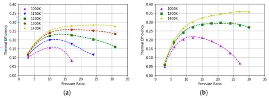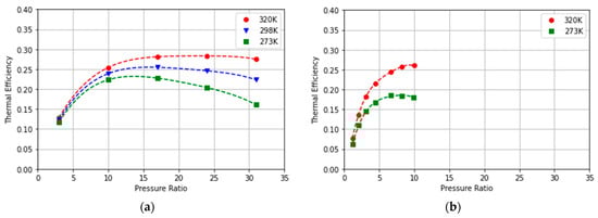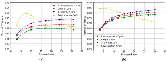 For the Brayton cycle (1), in the first step, the working fluid, a single phase-gas, is compressed at a certain Pressure Ratio (PR). This medium is then heated to a Flaming Temperature (FT), defined by the maximum combustion temperature reached inside the HCs. The heating process can be realized in multiple ways, e.g., by combustion with a fuel like methane or hydrogen, or by heat exchange utilizing solar heated water or an external burner. Then, in the third step, the fluid medium is expanded in a turbine, which produces electricity and subsequently powers the compressor. Finally, as most of Brayton cycles are open process cycles, the exhaust is released directly into the atmosphere [25]. Brayton cycle-based architectures are flexible and modular, which allows them to be designed in different ways. Such architectures include a combination of compressors, turbines, and heat exchangers to reduce fuel consumption or via the addition of external components, e.g., solar panels, external heaters, and oxidizers. The output fluid can be reinjected into a heat exchanger located just before the thermal addition to reduce heat loss, hence increasing the cycle thermal efficiency (TE), resulting in regenerative cycles.