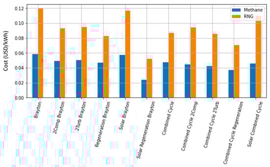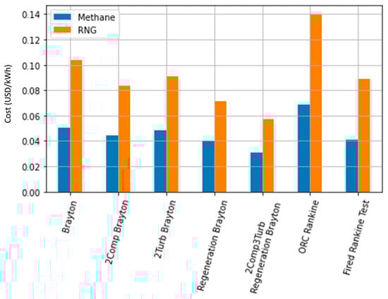 The parameter considered for the choice of the optimum HC is the cost of electricity, expressed in USD per kilowatt-hour ($/kWh). The MDA approach is oriented towards a customers’ perspective. Variables, such as TE or fuel flow, are of interest to engineers but do not show what matters most for the customer: the financial aspect. Indeed, cost optimization is of paramount importance from an industrial perspective [30]. Furthermore, this cost of electricity can be readily compared to prevailing market prices, enabling a comprehensive assessment of competitiveness and cost-effectiveness in an industrial context. Therefore, the customer can readily discern whether the proposed solution is competitive and aligns with their budgetary constraints.