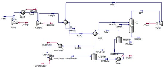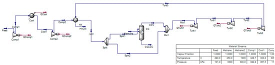 Figure 4 illustrates the primary interface of a standard Brayton cycle in Aspen HYSYS. The components and the medium streams that connect them are represented, as well (as the energy streams).