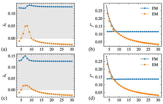 Here, and are two matrices that are constructed based on operators involved in discretizing the linearized equations. By using the normal-mode assumption (where is the circular frequency), Equation (4) can be reformulated as a generalized eigenvalue problem: . We utilize the shift–invert iteration method provided in software packages PETSc 3.20.0 and SLEPc 3.20.0 to solve this generalized eigenvalue problem. The linear stability solver has been thoroughly validated by computing eigenvalues and eigenmodes for the FIV system of flow past an elastically mounted cylinder [16]. In the current study, the residual tolerances on eigenvalue and eigenvector are set to .