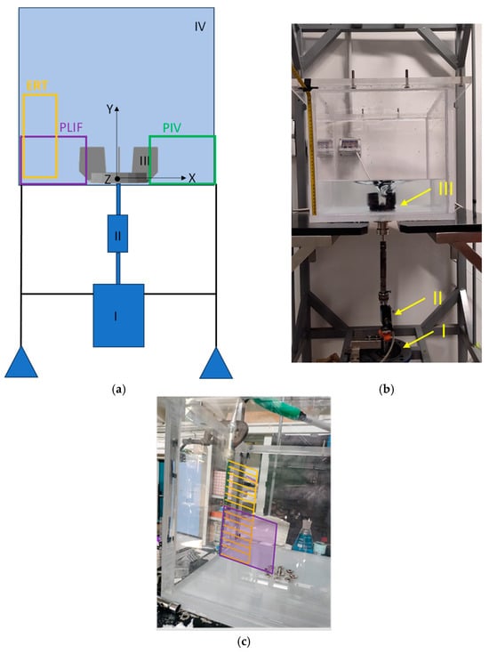 In Figure 1a, the schematic of the rig used for this work is shown. A cubic vessel with a volume of 50 L and dimensions matching those of the Flexel Levmixer (square base of 395 mm × 395 mm, T × T, (IV)) was utilized for this study. Key differences from the original vessel include the use of plexiglass for the walls instead of disposable plastic, ensuring optical transparency, and a standard shaft connection to the motor (I) for accurate measurement of impeller power consumption, as opposed to a magnetic levitation system. For agitation, a 3D-printed version of the original impeller (III) with a diameter of 126 mm was installed. The 3D printer used was a Guider IIs (Flashforge, Hangzhou, China). The rig schematic is illustrated in Figure 1a. The motor (I) is linked to a variable frequency driver, enabling precise control of the impeller speed. It connects to the impeller via a detachable shaft, fitted with couplings for integrating the Kistler torque sensor (II) type 4502A0.5HA, which has a measurement range of 0.5 Nm. Detailed information about the theoretical background of the torque measurements and standard operating procedure can be found in the previous work by Alberini et al. [2].