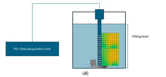 For these experiments, a vertical plane was captured using a linear probe equipped (as shown in Figure 1d) with 16 electrodes and 2 grounding electrodes, with dimensions of 20 mm by 5.5 mm. The probe was connected to an ITS P2000 ERT system from Industrial Tomography Systems Ltd., Manchester, UK. The electrodes were linked to the data acquisition system (DAS) via coaxial cables.