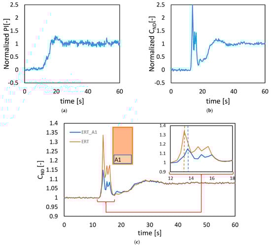 In Figure 2, for a selected condition where the liquid height is 26 cm and N = 70 rpm, the normalized data are presented, respectively, for PLIF measurement (Figure 2a) and for ERT measurement (Figure 2b). In Figure 2c is an example of how the transient information of the tracer signal can change by just selecting a different area of interest. In this case, we have selected two different areas of a tomogram (full tomogram and bottom quarter) for the same time signal of Figure 2b. A similar trend was also observed for the PLIF measurements.