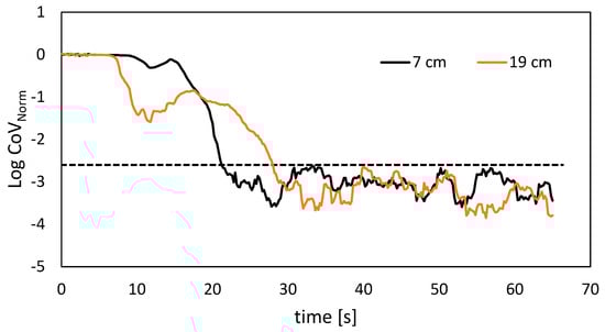 Example of how the 95% mixing time has been determined from the CoVNorm for the PLIF experiments at 7 cm and 19 cm at N = 70 rpm.