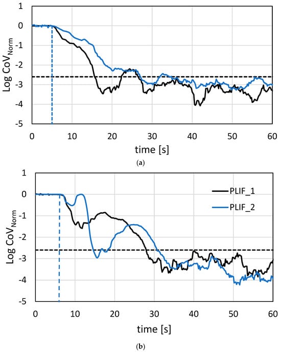 where CoV(t = 0) is the averaged CoV value before the injection of the tracer, CoV(∞) corresponds to the complete homogenization condition at t = ∞.