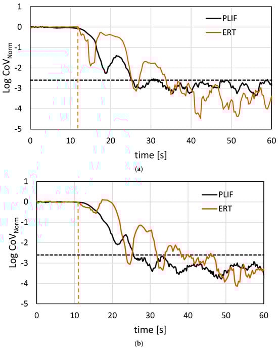 For the PLIF images, PI corresponds to the average pixel intensity value of the image in the instant in time. For the ERT tomograms, CND corresponds to the average non-dimensional conductivity value of the tomogram in the instant in time. While the normalized PI and CND correspond to general χi of Equation (1):