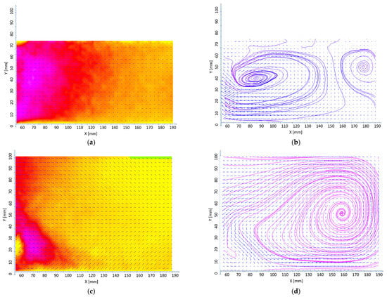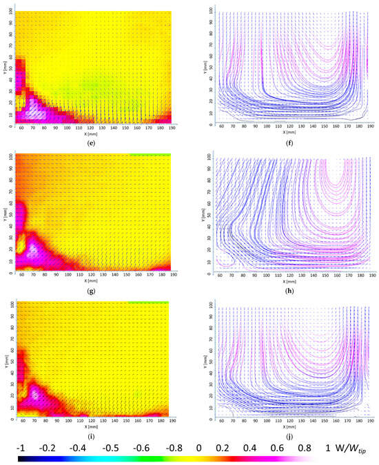 Figure 7g,i show the flow at the 26 cm and 32 cm filling levels, respectively. The color distributions for these two cases are similar, and as seen in the corresponding streamline maps (Figure 7h,j), the flow structure does not change significantly compared to the previous filling levels.