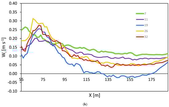 Finally, Figure 7k shows the distribution of the tangential component for a fixed axial position at Y = 20 mm at different radial positions. Interesting trends can be depicted from the plot. At lower filling levels (7 and 11 cm), the profiles exhibit a declining trend from the impeller tip (on the left side of the plot) towards the tank wall (on the right side of the plot). Meanwhile, for other filling levels, the trend is similar to the ones observed in previous works for the un-baffled stirred tank [20,21,22,23].