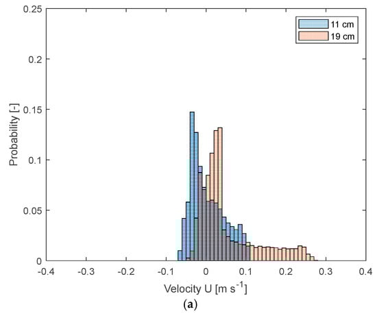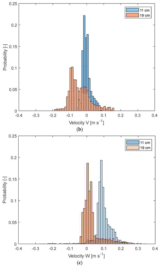 Focusing on the differences in the flow field between the 11 cm and 19 cm filling levels (Figure 7c vs. Figure 7e and Figure 7d vs. Figure 7f), the velocity distributions for all three components are extracted and plotted in Figure 8. In all experiments, the impeller speed is kept constant at N = 70 rpm. From Figure 8a, it is evident that the radial velocity (U) shifts towards higher positive values as the filling level increases from 11 cm to 19 cm. Similarly, for the axial component (V, Figure 8c), the shift between the two filling heights is clearly visible (as also shown in Figure 7c,e), with the velocity distribution moving to the left. This shift is attributed to the down-pumping action of the impeller. The transition from 11 cm to 19 cm corresponds to a change from a “pure” radial impeller flow to a mixed axial-radial flow (Figure 7d,f). This trend is further highlighted by the shift in the tangential component distribution (W, Figure 8b), where solid-body rotation is more pronounced at the lower filling level compared to when the impeller operates in an axial-radial mode.