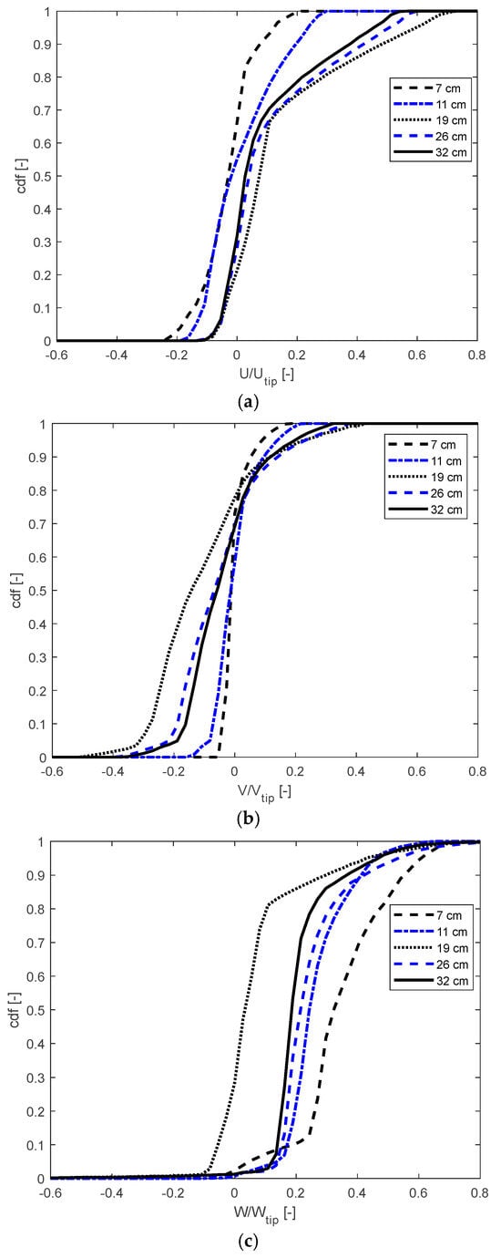 In Figure 9, the cumulative density functions (CDFs) of the velocity distribution for the radial (U), axial (V), and tangential (W) velocity components are presented for all the different filling heights studied in this work. Each velocity component is normalized by the corresponding tip speed, denoted by Uₜᵢp, Vₜᵢp, and Wₜᵢp, all of which are equal to πND. For the radial component (Figure 9a), starting from the lowest filling height (7 cm), an increase in the liquid level shifts the distribution to the right, indicating that the flow increasingly favors radial motion while reducing velocities close to zero. This trend reaches its maximum at a filling height of 19 cm, where the highest radial velocity is observed. Further increases in the volume (or filling height) cause the distribution to shift back to the left, with the maximum absolute radial velocity decreasing. In contrast, for the axial component (Figure 9b), where negative velocities dominate, the overall trend is opposite: the distribution shifts to the left, starting from the lowest filling height. The maximum absolute (negative) velocity is again reached at 19 cm. As explained in the previous work by Alberini et al. [2], such high axial velocities correspond to a high pumping capacity of the impeller, which leads to maximum values of both Po and P/V. Finally, for the tangential component (Figure 9c), the trend mirrors that of the axial component. This shift is primarily due to the change in flow structure, which transitions from a solid-body rotation at low volume (7 cm filling height) to an axial flow at high volume (32 cm filling height), as clearly shown in Figure 7b,d,f,h.