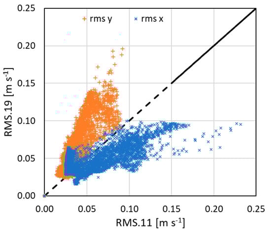 Turbulent flow is characterized by the temporal fluctuations in fluid velocity at any given point. For flows that are steady on average in any coordinate system, the instantaneous velocity signal can be decomposed into two components: an ensemble-averaged mean component and a fluctuating component (i.e., deviation from the mean) [24]. The fluctuating component includes both true turbulent velocity fluctuations and a periodic component caused by the position of the impeller. Since the fluctuating component can take both positive and negative values, it is common practice to characterize it using the root mean square (RMS). Figure 10 presents the RMS values for the radial and axial components at two selected filling heights (11 and 19 cm) in a parity plot for comparison. In Figure 10, approximately 4800 data points are shown for each filling height, corresponding to the number of PIV cells, the same number of cells used in Figure 7, except for the lower filling height. Thus, the comparison presented in Figure 10 is made on a cell-by-cell basis.