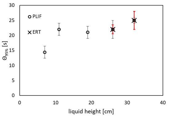 95% Mixing time vs. filling height at N = 70 rpm obtained for PLIF and ERT measurements. Grey error bar, PLIF measurements; red error bar, ERT measurements.
