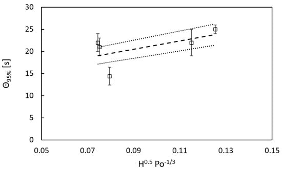 where the key parameters of interest for our purpose are Po and H (filling height), while other parameters such as D, N, and T (tank diameter) are constant in our data and hence less relevant for the characterization of the 95% mixing time (θ95). Considering that this correlation is valid for a cylindrical tank, the constant used may not be relevant for our system, and the exponents used for the different parameters are neither optimal for our system. Moreover, this correlation generally has a 10% standard deviation on the predicted data for the 95% mixing time.