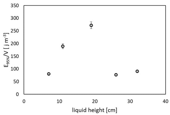 Energy per unit volume to reach 95% of the perfect mixing at different filling heights.