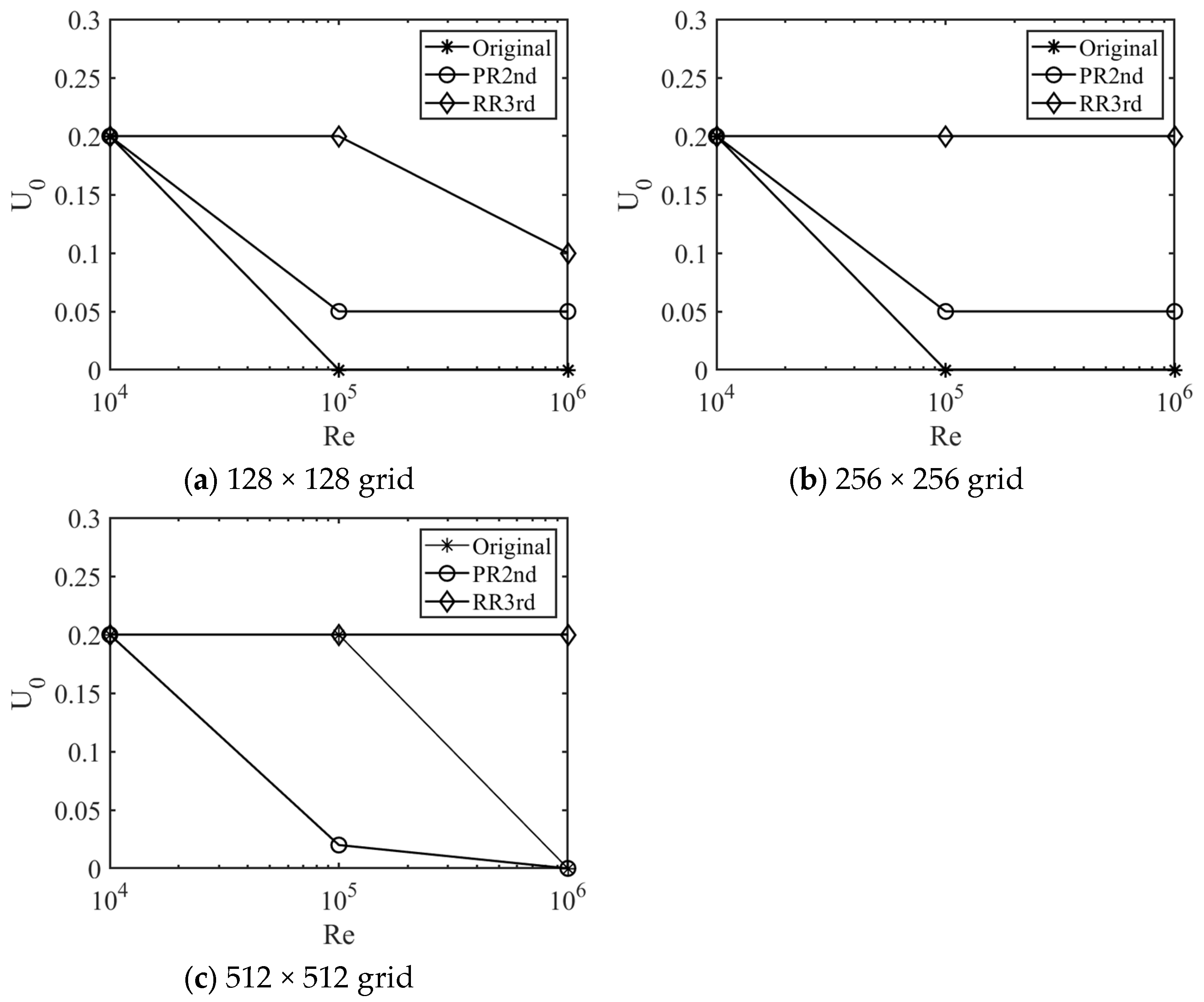 - Wissocq, G.; Coreixas, C.; Boussuge, J.F. Linear stability and isotropy properties of athermal regularized lattice Boltzmann methods. Phys. Rev. E 2020, 102, 053305. [Google Scholar] [CrossRef]