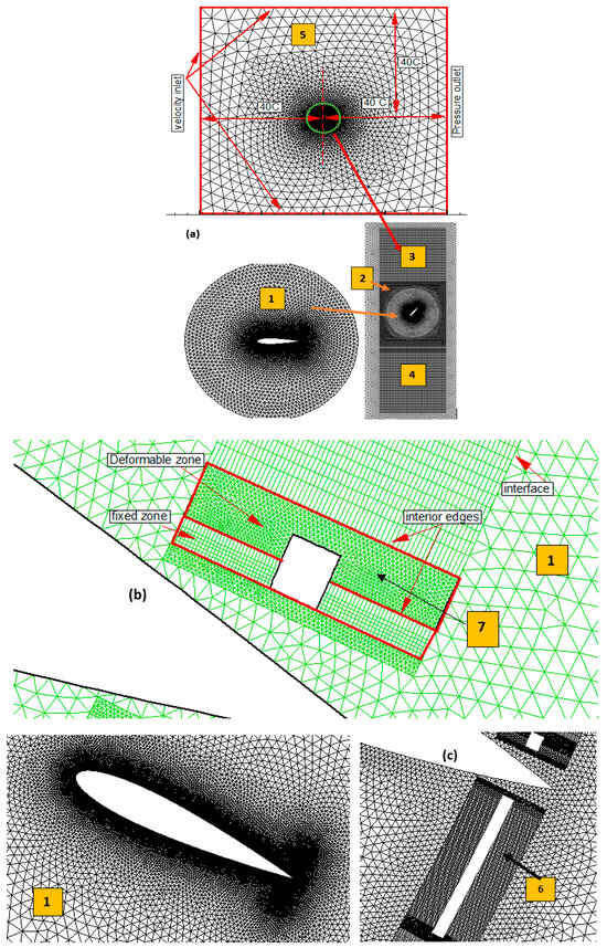 This research involves two Gurney flaps’ installation on the suction and pressure surfaces of the airfoil, located near the trailing edge, while maintaining the airfoil’s initial shape, as depicted in Figure 2a. The DGFs and the main airfoil are regarded as separate entities, each with its own equations of motion. The aerodynamic forces’ evaluation is conducted for each component independently. Following this, the total forces acting on the proposed model are determined using external software. The movement in the Y direction is performed using a layering technique where zone 1 and zone 2 slide in zones 3 and 4. The zone 2 borders are two edges of the interior type that permit cutting or merging the adjacent cells. The pitching is achieved by rotating zone 1 around the pitching center using a sliding technique (Figure 3a). Zone 1 has a radius of 2.5c. The expandable part of the GF is zone 7 that moves rigidly by a sinusoidal motion (see Figure 3b). This technique has been adopted to preserve the grid quality during its deformation. The borders of this zone are also two edges of the interior type. This type of edge allows cutting or merging the adjacent cells.