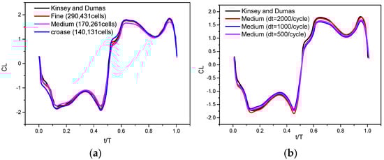 To check the grid independency, both lift coefficient CL(t) and power coefficient Cp (t) are evaluated compared to [28] at 0.14 and = 76.33° for a Reynolds number (Re) = 1100. The study by [28] provides a mapping of power extraction efficiency as a function of and . It was found that the highest efficiency can be achieved for 70 < < 80 and 0.12 < < 0.18. The results are also compared with [33] at = 0.1, = 75°, and . The airfoil in the work carried out by [28] executed a vertical path while [33] performed a reversed D-shaped trajectory. Figure 4a shows that the lift curve by the present solver almost matches the curves provided by [28]. This means that the influence of the grid number and time step can be practically ignored.