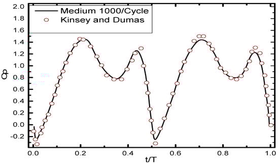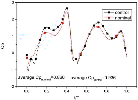 Instantaneous progress of Cp(t) at: = 0.14, = 0.6, and Re = 1100.