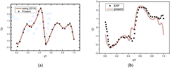 (a) Comparison of power coefficient Cp(t) with [33] at , , and Re=; (b) Comparison of lift coefficients with the experimental work of [36].