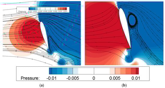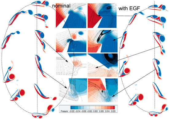 This phenomenon occurs as the effective angle shifts from positive to zero during the end of the upstroke. With the increase in the effective attack angle, an adverse pressure gradient is generated which gives rise to a separated shear layer for both clean and DGF cases as shown in Figure 8. The flow separation near the leading edge is followed by a reattachment along the remaining airfoil surface. This behavior forms the laminar separation bubble (LSB). Figure 7b shows that, for t/T < 0.2, the growth of the LSB sharply increases drag force for the two investigated flapping modes. From Figure 8 and Figure 9, it can be seen that the expansion of the DGF during the downstroke generates a turning vortex downstream of the airfoil, which increases the airfoil operative camber and total circulation. For the case with the DGF, a detached Karman vortex is found behind the airfoil, which reduces the adverse pressure gradient near the trailing edge and increases the velocity on the suction surface. This mechanism of control has an effect in two ways: it makes the LEV expand along the suction surface, delaying the flow separation, and supports the TEV strength and size which amplifies the pressure difference between the suction surface and the pressure surface, ultimately giving rise to a lift improvement. The peak of records a clear increase. Inappropriately, the DGF generates an unhelpful peak of drag force at around t/T = 0.25 as shown in Figure 7 due to the increment in lift-induced drag. A similar trend is recorded in the upstroke—not displayed here—where the expansion of the DGF gives rise to a turning vortex downstream of the airfoil, which increases the airfoil virtual camber and circulation. The detached Karman vortex appears behind the airfoil and reduces the adverse pressure gradient near the trailing edge. The average output power increases from 0.86 to 1.028, which represents an improvement by about 19.5%. The continued drop in the effective attack angle near the end of the downstroke drives the separated shear layer far from the foil’s surface as shown in Figure 8 and all forces reach their lowest value again.