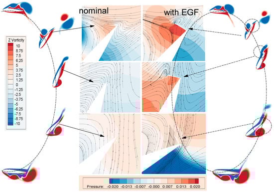 From Figure 11 and Figure 12, it can be seen that the expansion of the DGF during the downstroke generates a turning vortex downstream of the airfoil, which increases the airfoil operative camber and total circulation. For the case with the DGF, the presence of the DGF reduces the adverse pressure gradient near the trailing edge and increases the velocity on the suction surface. This mechanism of control has an effect in two ways: it makes the LEV expand along the suction surface, delaying the flow separation, and supports the TEV strength and size which amplifies the pressure difference between the suction surface and the pressure surface, ultimately giving rise to a lift improvement.