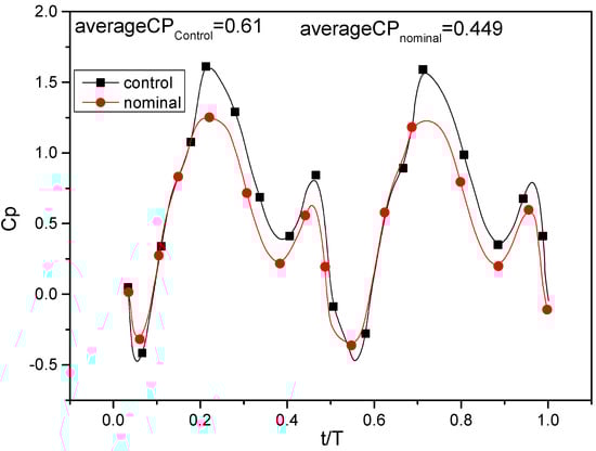 Figure 13 and Figure 14 indicate that the peak of Cp(t) records a clear increase. The DGF cases generate helpful peaks of output power at around t/T = 0.25 and t/T = 0.75.
