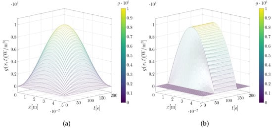 The objective is to reconstruct the source term  g ( x , t ) , treated as unknown in the problem, and here expressed as an eigenfunction expansion on the same basis used to represent the potential, i.e., the one given by the eigenvalue problem in Equations (13) and (14), following the same principle discussed in refs. [7,27,28]. Thus: