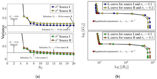 in a manner that  ϕ s e  represents the simulated experimental data at position s ϕ s num  is the numerical solution of the direct problem, and  ϵ s  is the measurement error,  η , assumed to follow a normal distribution of errors with a mean of 0 and a standard deviation of  σ e . To prevent uncertainties from propagating through the inverse problem solution, the truncation of the solution of Equation (25) is controlled by the discrepancy principle [8,37], where the variance of the data,  σ ^ 2 ( N T ) , defined by Equation (37), should be close to the known experimental variance  σ ^ 2 ( N T ) σ e 2 .