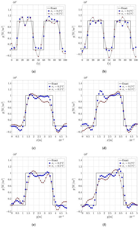 The inverse problem of source term estimation is typically addressed by analyzing temperature measurements of the phenomenon or system under investigation. These data often contain measurement errors, contributing to the ill-posed nature of the inverse problem—small variations in the input data (measurement noise) are typically amplified in the solution, potentially leading to significant errors in the estimated parameters. Mathematical processes known as regularization methods help stabilize the solution and mitigate these effects. Among the various techniques available in the literature, one can find the Tikhonov regularization [36] is the most classical, which consists of minimizing a functional to determine the smooth solution to the inverse problem. Besides this, we have the Morozov’s discrepancy principle, ref. [37], which defines that the iterative method should be stopped if the discrepancy between the approximate solution and the observed data is approximately equal to the noise level present in the data, as well as Least Absolute Shrinkage and Selection Operator (LASSO) [38] and the singular value decomposition (SVD) method [39]. In the context of regularization of inverse problems, the formulations adopted within the Bayesian inference framework should also be cited, utilizing Markov Random Fields (MRFs) priors for regularization. These formulations provide a robust approach and contribute to solution stabilization [13,40,41].