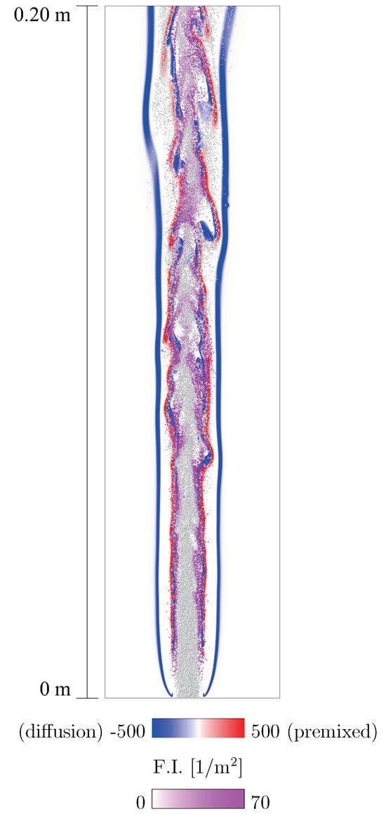 where and denote the mass fractions of the fuel and oxidizer, respectively. The calculated F.I. can be used to distinguish between premixed flames and diffusion flames, with positive values indicating premixed flames and negative values indicating diffusion flames.