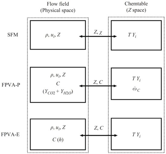 Flamelet methods have been applied to a wide range of turbulent combustion problems, from laboratory-scale burners (e.g., [,,]) to flames inside combustors (e.g., [,]), and furnaces [,]. A fundamental study on the Flamelet/Progress-Variable Approach (FPVA) for spray flames was conducted by Baba and Kurose [], while a study on coal flames was conducted by Watanabe and Yamamoto []. Figure 3 provides an overview of the data interaction between physical space and mixture fraction (Z) space. In Figure 3, FPVA-P and FRVA-E define the progress variable (C) as the combustion products () and the total enthalpy of chemical species, respectively. In the FPV method, the conservation equations for the mixture fraction (Z) and progress variable (C) are solved in physical space, and the temperature (T), mass fraction of chemical species (), and reaction rates() are obtained by referencing a database or Chemtable using Z and C as indices. The Steady Flamelet Model (SFM) shown in the figure refers to the classical flamelet method proposed by Peters [], which does not take into account the progress variable.