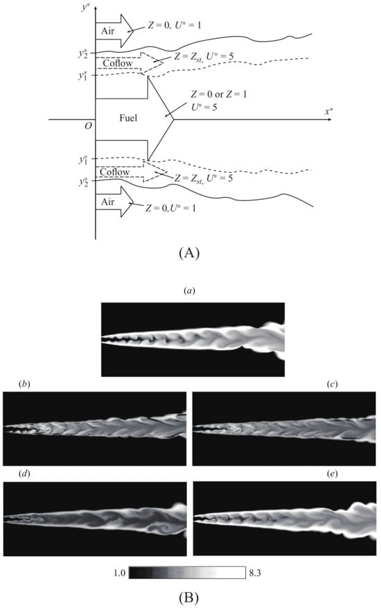 The study of the spray-jet flame using the flamelet/progress-variable method. (A) Schematic of the computational domain and inlet conditions. (B) Comparison of instantaneous distribution of gaseous temperature (). (a) LAR (Arrhenius formulation); (b) LFM (steady flamelet); (c) LFMM (modified steady flamelet; ); (d) LFM-P (flamelet/progress-variable; ); (e) LFM-E (flamelet/progress-variable). These figures are adapted from Baba and Kurose [].
