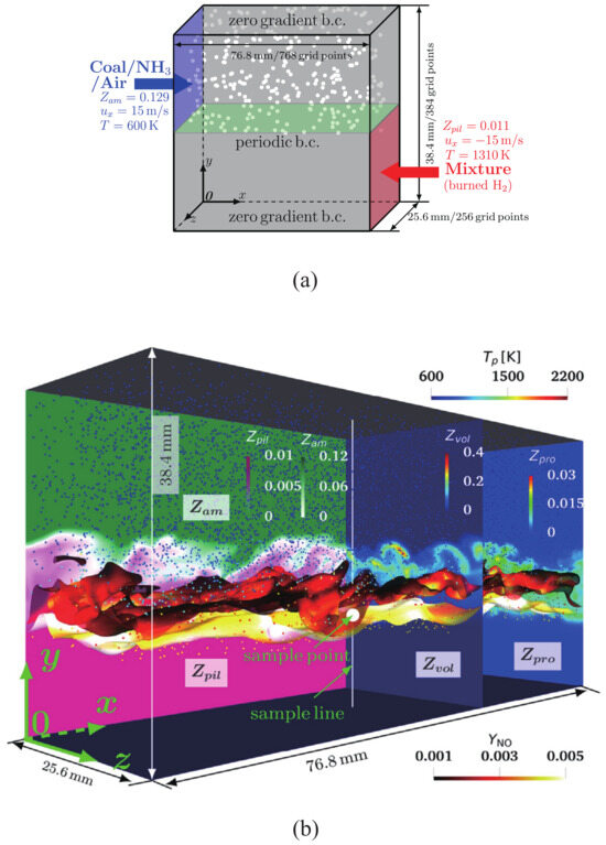 The study of the pulverized coal/ammonia co-firing flame in the turbulent mixing layer. (a) Schematic of the computational setup. The white dots represent the pulverized coal particles at the initial time instant. (b) Instantaneous contours of various mixture fractions of , , , and in the turbulent mixing layer at . The temperature iso-surfaces correspond to , corresponding to the peak temperature of the NH3/air mixture. The iso-surfaces are colored according to the local value of . A total of 8000 sample coal particles colored according to their temperatures are superimposed. These figures are adopted from Wen et al. [].