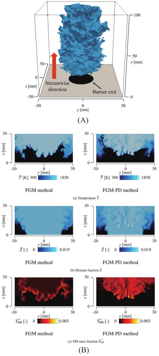 Figure 7 presents a study of the combustion field of a lean, premixed H2/air low-swirl lifted flame []. In this study, the preferential diffusion characteristics are expressed as the sum of the molecular diffusion coefficients of each chemical species, weighted by their mass fractions. This diffusion coefficient is then used to solve the conservation equations for the mixture fraction (Z) and the reaction progress variable (C). Figure 7B shows a comparison between the conventional FGM method and the FGM-PD (Preferential Diffusion) method, which accounts for the preferential diffusion of chemical species. The FGM-PD results reveal inhomogeneous distributions of and near the flame front. Specifically, and increase on the burnt gas side of convex regions and decrease on the concave regions facing the unburnt gas side. This behavior is caused by the preferential diffusion effect, where molecular diffusion of highly diffusive species, such as H2, occurs from the unburnt to the burnt gas side. These species converge in convex regions of the flame front and diverge in concave regions, directly impacting the distribution of .