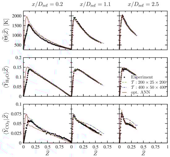 Figure 8 presents the results of analyzing the Sydney methane–hydrogen/air flame (SMH1) [] using a compressed flamelet database []. In Figure 8, the calculation results obtained employing the ANN method for temperature and water mass fraction show good agreement with experimental data at and 2.5 as other table calculations. The slight underprediction of the CO2 mass fraction observed around at is not attributed to the ANN method but, rather, to the strong sensitivity of CO2 to the progress variable and small differences in between simulations employing the ANN method and those employing conventional tabulation techniques.