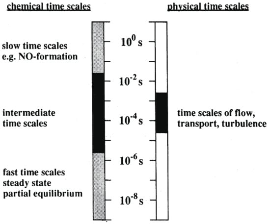 Characteristic time scales in turbulent reactive flows. This figure is adapted from Maas and Pope [].