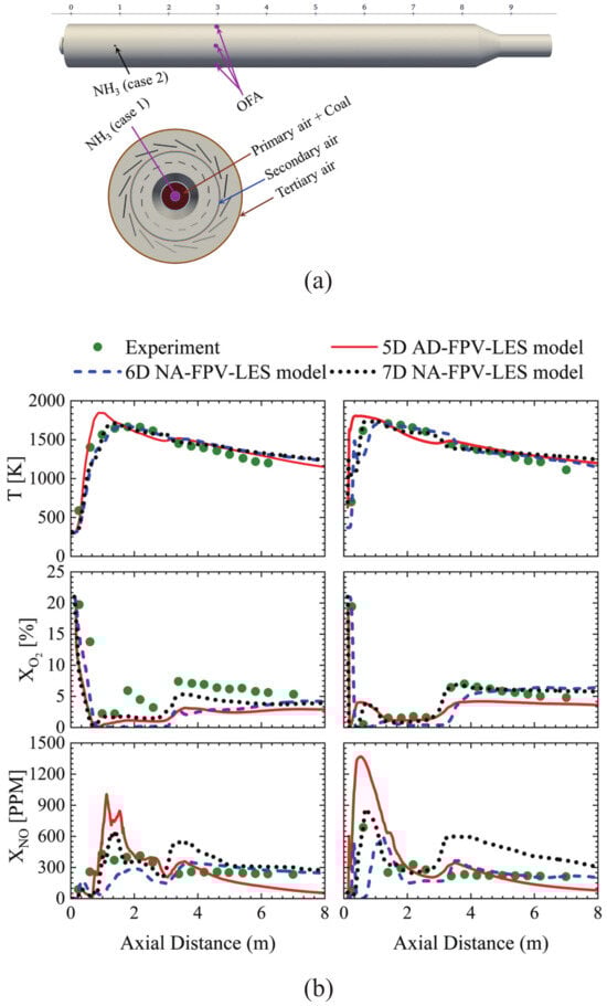 The study of ammonia/coal co-firing on a semi-industrial-scale complex burner. (a) A schematic illustration of the computational domain, including an enlarged view of the burner. (b) Comparison of 7D NA-FPV-LES model prediction for temperature (top), O2 mole fraction () (mid), and NO mole fraction () (bottom), with experimental data and results from the 6D NA-FPV-LES and 5D AD-FPV-LES models for ammonia injection into the burner (left) and 1.0 m downstream (right). These figures are adopted from Yadav et al. [].