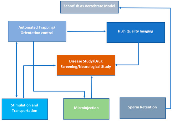 The various research areas involving zebrafish as a vertebrate model are closely interconnected. For instance, conducting comprehensive studies on diseases, drug screening, or neurology often requires suitable platforms to observe detailed phenotypic responses to different stimuli. This, in turn, necessitates effective methods for trapping and orientation control of larvae to enable high-quality imaging, along with systems that ensure precise control of stimuli throughout experiments, all while minimizing stress or morphological abnormalities in the larvae. Additionally, understanding disease mechanisms demands advanced microinjection techniques for the targeted delivery of drugs or cells to specific organs or body parts of zebrafish. Moreover, to support these extensive research needs, it is crucial to have an abundant supply of zebrafish, which highlights the importance of efficient techniques for the storage and activation of sperm from various zebrafish lines. Figure 1 illustrates the interconnections between these research areas as discussed.