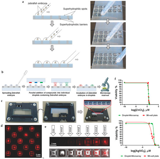 Droplet microarray (DMA) (a) Schematic representation (left) and images (right) of the process of spreading zebrafish embryos using the effect of discontinuous dewetting. (b) Schematic representation of the sandwiching method. (c) Sandwiching aligner. From left to right: upper holder of the aligner with glass slide preprinted with substances of interest, lower holder of the aligner with a droplet microarray slide containing zebrafish embryos, closed aligner containing the droplet microarray with zebrafish embryos sandwiched, and glass slide preprinted with substances of interest. (d) Microscope images of the droplet microarray containing zebrafish embryos after the addition of a fluorescent dye (fluorescently labeled peptoid NlysNlysNpheNlysRhodB, ID number 175) in the checkerboard pattern. (e) Microscope images of a droplet microarray slide containing zebrafish embryos after addition of different amounts of the dye. (f) %Viability under the influence of ZnCl2 and AgNO3 for DMA and traditional 96-well plate. Reproduced from ref. [61] with permission from John Wiley and Sons.