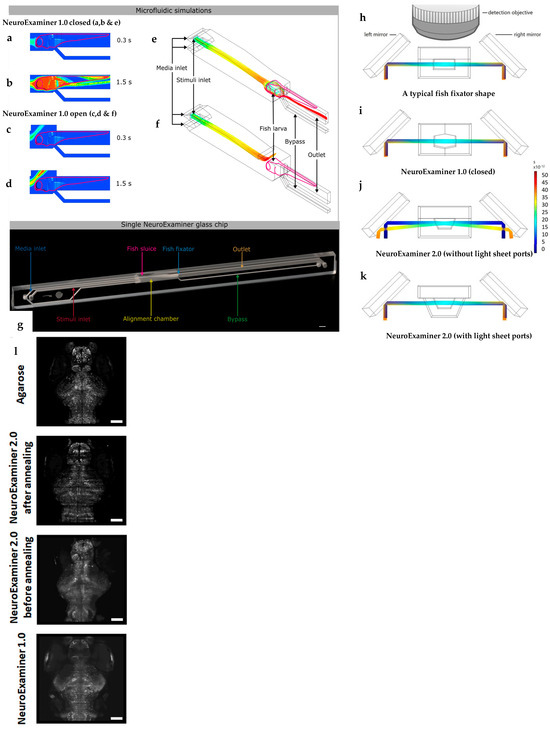 (a–d) Simulation of the targeted stimulus injection at a volume flow rate of 0.1 µL/s with simultaneous supply of oxygen-enriched medium at 1 µL/s in a cross-sectional view in the closed (a,b) and open (c,d) NeuroExaminer 1.0 versions at 0.3 and 1.5 s after the entry of the stimulus into the alignment chamber. The color-coded distribution shows the concentration (blue = 100% medium and red = 100% stimulus) in the mid-plane of the channel and on the larval surface after impacting the larva. (e,f) Three-dimensional view of streamline patterns of injected stimuli (blue = 0 mm/s, red = 25 mm/s) in the closed (e) and open (f) system variant simulated assuming the same inflow volume currents as in (a–d). The larva head experiences a homogeneous stimulus exposure in the closed system, whereas, in the open system, the stimulus is also directed outside of the device reducing the exposure. (g) Image of NeuroExaminer 1.0. (h) Illumination conditions assuming an obvious but not feasible fish fixator shape (i) The illumination conditions in NeuroExaminer 1.0. (j). In NeuroExaminer 2.0, before and (k) after light sheet ports were introduced. (l) Maximum intensity projection of light sheet images of 21 optical sections of zebrafish larvae (5 dpf) expressing nuclear-localized GCaMP6s in the nervous system that where either obtained after embedding in agarose or using one of the three different NeuroExaminer designs (the scale bar in all images represents 100 μm). (a–g) are reproduced from ref. [72] with permission from Springer Nature under the CC BY license and (h–l) are reproduced from ref. [73] with permission from Frontiers under the CC BY license.