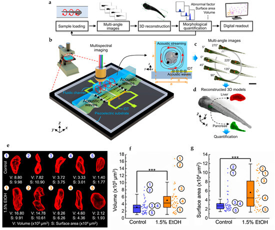 Chen et al. [74] employed an acoustofluidic rotational tweezing (ART) method for high-speed, contactless 3D multispectral imaging and digital reconstruction of zebrafish larvae (Figure 6a). Using an acoustofluidic chip with an interdigitated transducer (IDT) fabricated on a lithium niobate substrate, acoustic waves generated single-vortex acoustic streaming for larval rotation (Figure 6b). This method captured multiple 2D images from various angles (Figure 6c), which were subsequently reconstructed into 3D models using computer vision algorithms for phenotypic analysis (Figure 6d). This system provided a highly efficient and automated approach to analyze morphological features quantitatively. As a validation approach, they utilized the system to study the morphological changes in the liver of zebrafish larvae such as enlarged size and surface roughness under the influence of 1.5% EtOH (Figure 6e–g).