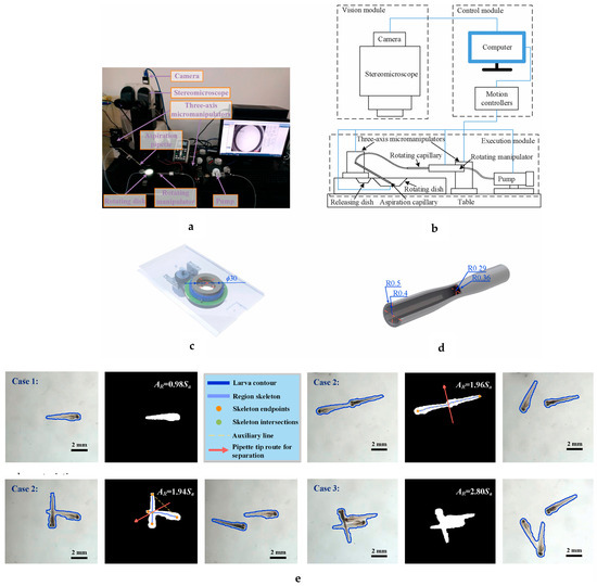 High-throughput imaging system. (a) Experimental setup with the instruments. (b) Schematic representation of the system consisting of a vision module, a control module, and an execution module. (c) Three-dimensional model of the rotating dish operated by a stepper motor to rotate the targeted larva around the optical axis for aspiration. (d) Three-dimensional model of the rotating capillary with narrow restricted portion to facilitate immobilization of larvae of different ages. (e) Binary image of the aggregated larvae to determine the strategy for separation. Reproduced from ref. [75] with permission from Elsevier.